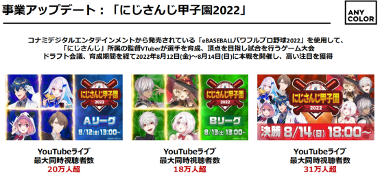 8月,彩虹社举办了“2022彩虹社甲子园”活动,参赛的VTuber在《eBASEBALL 实况野球 2022》游戏中比赛,共有3轮直播,决赛最大同时在线观看人数超31万人,观看次数超336万次。