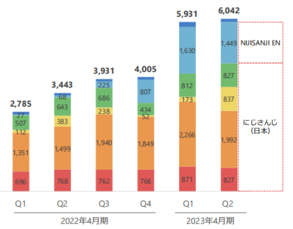 日本NIJISANJI方面,二季度销售额41.22亿日元,三季度销售额44.83亿日元,占比超整体7成,是ANYCOLOR的主要收入支柱。