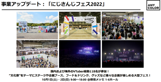 10月,举办大型线下活动“彩虹社FES2022”,日本、EN(英语)及KR(韩国)、ID(印度尼西亚)的118名VTuber参与,以“文化祭”为主题,可以享受舞台、企划展位、食物和饮料、商品等各种企划,并举办了NIJISANJI4周年纪念3D演出“FANTASIA”。