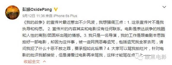 据彭顺所言,引发争议的宣传片并不是由他执导的,而且与电影内容毫无关系。