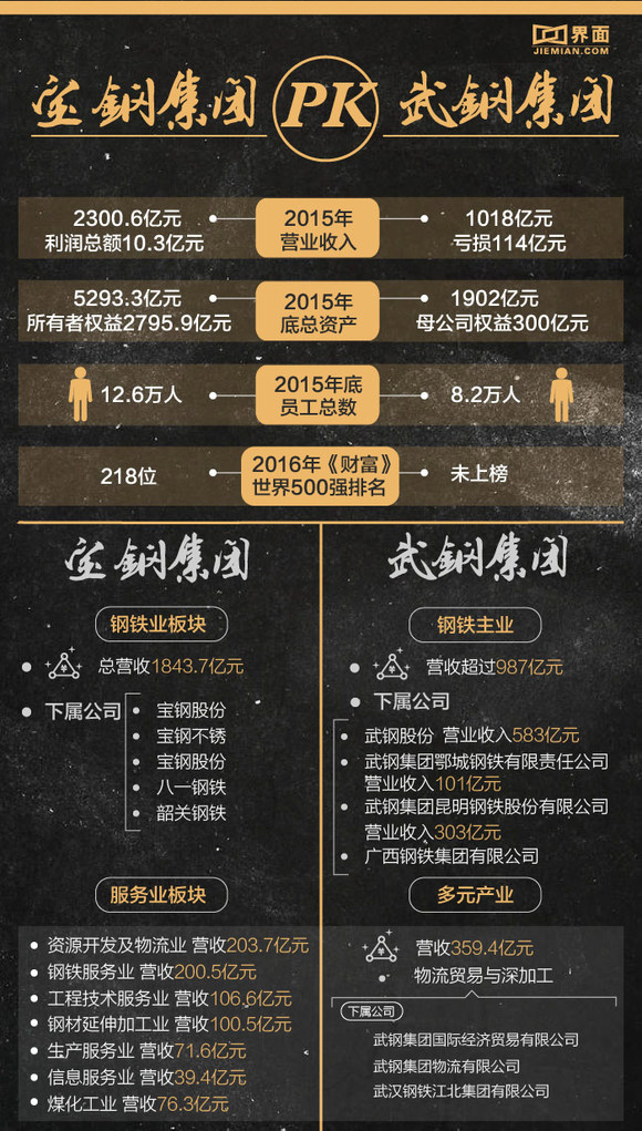 去年,宝钢集团实现销售收入2300亿元,利润总额约10亿元。而武钢集团营业收入1018亿元,亏损114亿元。在2015年的财富500强排名中,宝钢集团位列218名,武钢集团排名第500位。而到了2016年,宝钢集团的名次并未改变,但武钢集团则因为业绩下滑跌出了榜单。