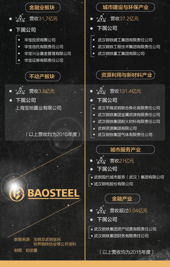 除了钢铁主业外,武钢和宝钢集团均拥有多个业务板块。武钢集团旗下,设有物流贸易与深加工、城市建设与环保以及资源利用与新材料等多元化板块。而宝钢集团亦有资源开发及物流业、工程技术服务业、信息服务业和金融业等多项非钢业务。