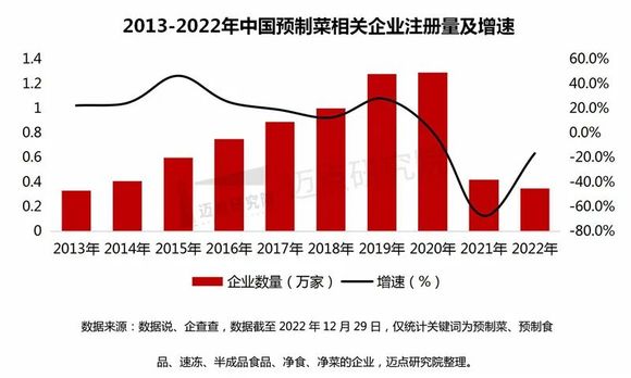 企查查数据显示,截至2022年12月29日,我国现存预制菜相关企业7.59万家。近10年来,我国预制菜相关企业注册量整体呈上升趋势,其中,2018年注册量超过1万家,2019年新增1.28万家,2020年新增1.29万家,2021年新增4212家,2022年新增3470家。不难看出,2020年预制菜相关企业增长势头最猛,2021年和2022年增速下滑。近年来,由于疫情的影响和冷链技术的逐步完善,预制菜行业在餐饮变革和居家消费的推动下迎来行业风口,行业入局者增多,竞争进一步加剧。