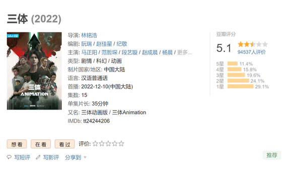不过,手握如此大的IP,游族的开发进程却一直不顺利。无论是《三体》电影,还是《三体》游戏,至今都未面世;电视剧原本计划在2022年9月播出,如今也已跳票到了今年;而由B站和艺画开天联合制作的《三体》动漫,更是在上映后出现口碑暴跌,至今豆瓣评分已跌至5.1。