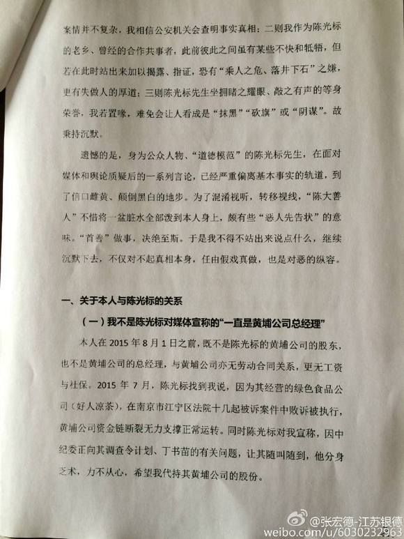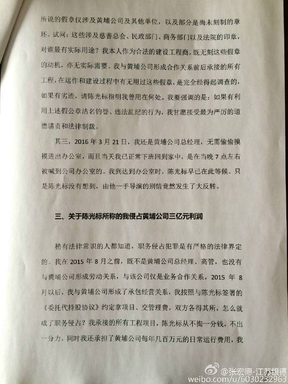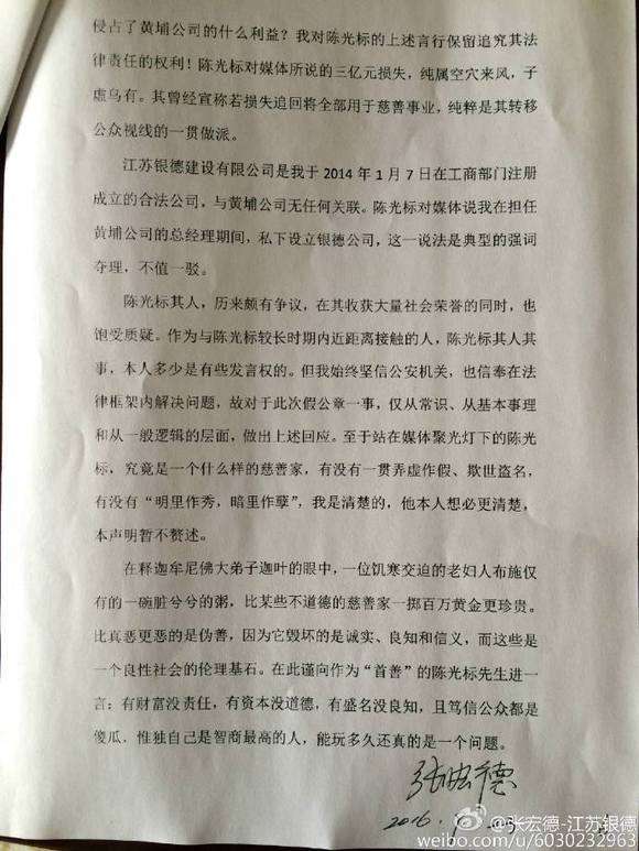 对于陈光标的上述不实和恶意栽赃,我张宏德本人,现通过个人微博和微信,逐一进行回应: