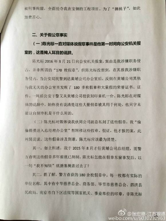 陈光标自称2016年3月21日向公安机关报案,说江苏黄埔再生资源利用有限公司原总经理张宏德私刻170枚假章。