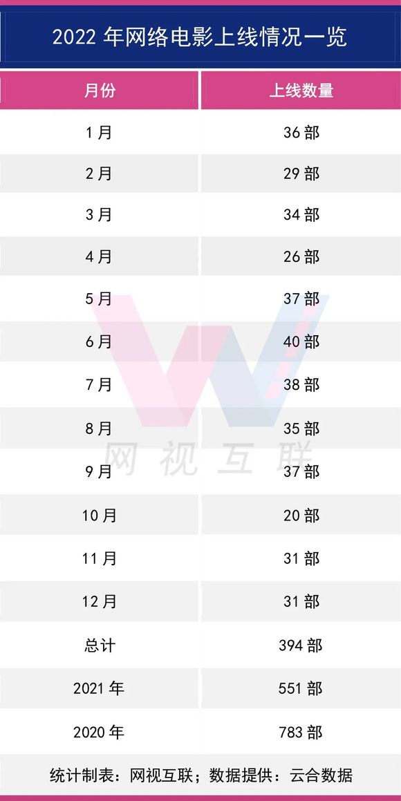 据云合数据提供给网视互联的独家数据显示,2022年各视频平台上线网络电影共394部。上新数量进一步缩减,较2021年减少了157部。