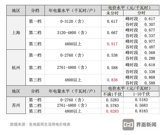 以上海、杭州、苏州三地的收费标准为例。当居民生活用电年用电量超过4800千瓦时,收费均步入第三阶梯。在上海,第三阶梯未分时电价高达0.917元,分别超出前两档电价的48%和37%。杭州第三阶梯未分时电价为0.838元,较前两个阶梯电价超出五成左右;苏州不满1千伏的第三档电价为0.823元,较前两个阶梯电价超出四成左右。