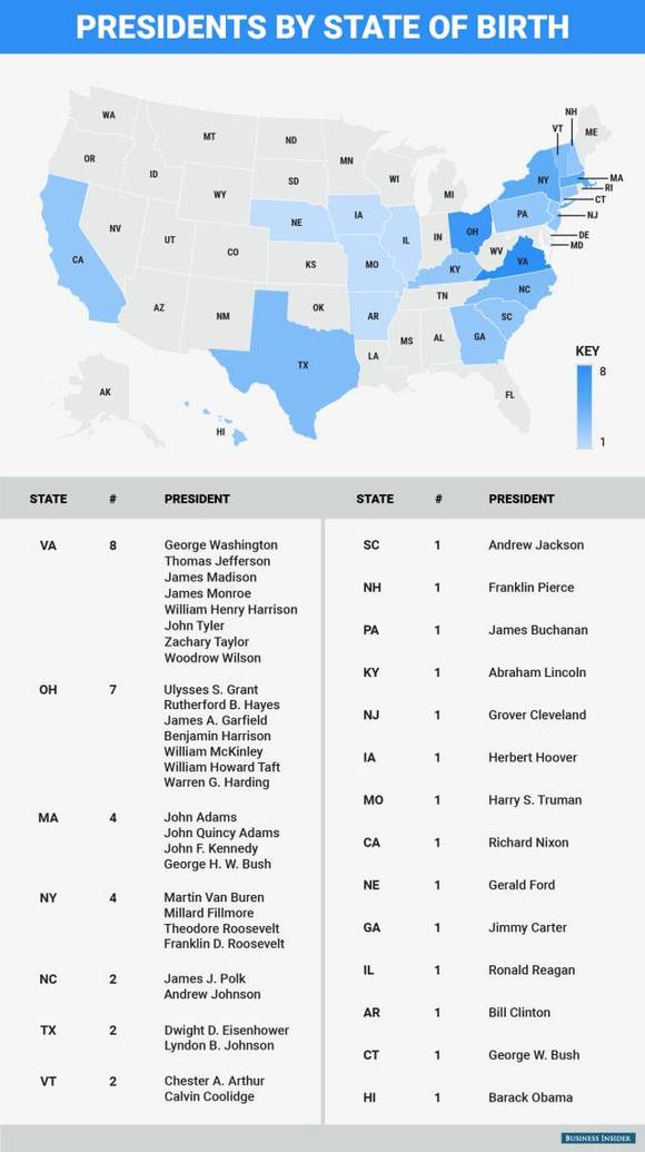 竟然有8位总统来自弗吉尼亚州,弗吉尼亚州因此被称为“总统之母”(Mother of Presidents)。大选在即,不知道是伊利诺伊州(希拉里)要多一位总统了,还是纽约州(川普)。