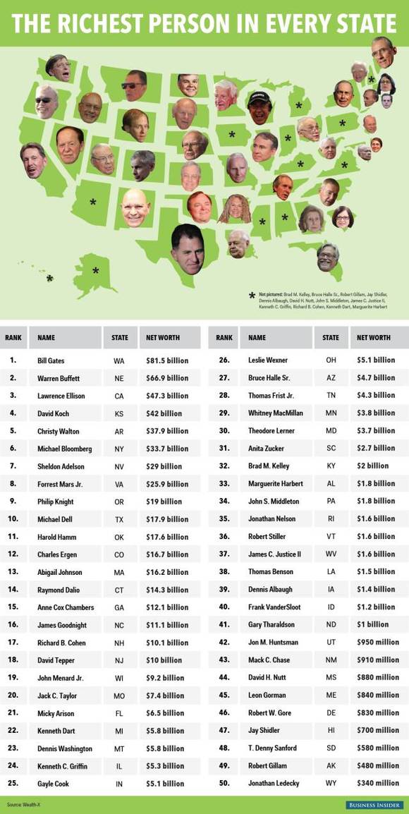 顺便来看看最有钱的究竟是哪些人。比尔盖茨,巴菲特大叔依然占据榜首。不过定睛一看,犹他、新墨西哥、密西西比、南达科他、缅因、特拉华、夏威夷、阿拉斯加和怀俄明等9个州中还没有亿万富翁的身影。