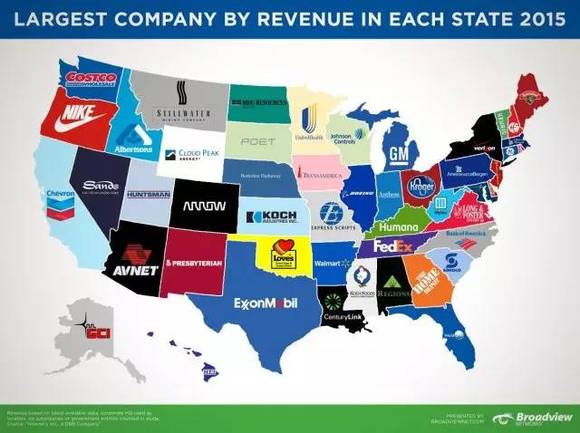此图表由Broadview Networks倾情制作,采用了Hoover's Inc的最新数据。乍一看,你可能会问:苹果和微软在哪里?是的,这些都是巨头公司,但这张地图关注的是2015年的总收入。比如,同样来自加州的苹果与雪佛龙,苹果的市值在2015年3月31日是7240亿美元,雪佛龙的只有1970亿美元。但是在年收入方面,雪佛龙以2030亿美元名列前茅。而阿肯色州的Wal-Mart Stores,则以高达4856.5亿美元的年收入列各州之最。