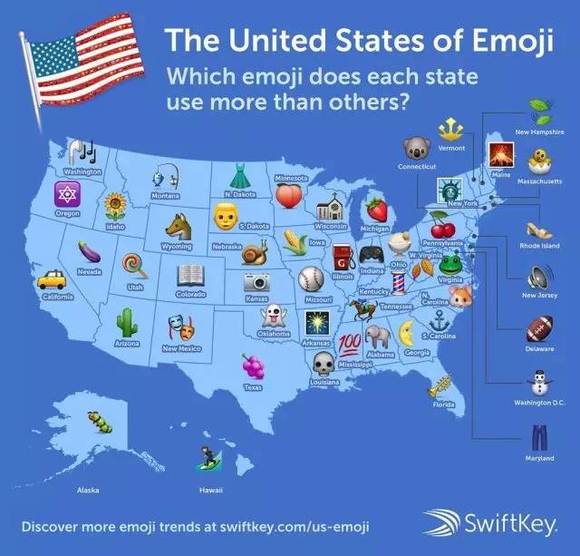 据统计,74%的美国人每天都会使用emoji(电子表情)。加州用户是出租车emoji的最大用户群,也许这是因为那里是Uber和Lyft的创世地;火山emoji则因缅因州拥有全球最大的一座超级火山而成为那里使用最普遍的表情;至于纽约市,哈哈,当然是自由女神像咯。