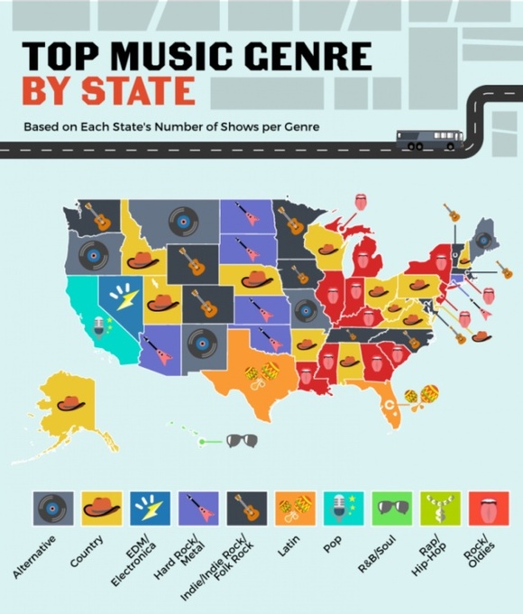 美国人民喜爱的音乐种类繁多,不过只有内华达州喜欢电子音乐,而热爱乡村音乐的地区散布全国,还有摇滚和饶舌只有东部人民喜爱~~