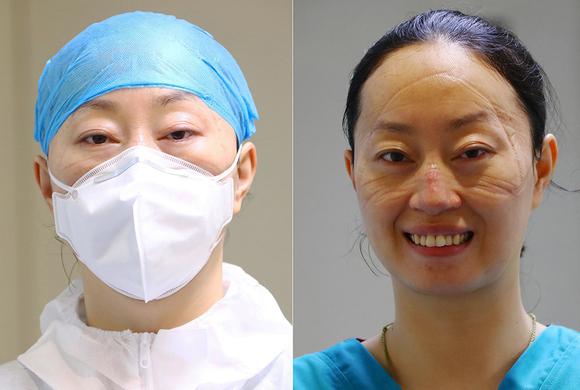 2020年3月7日,在南昌大学第一附属医院象湖院区,刚刚结束4个小时工作的女护士们走出重症医学科新冠病房,在潜在污染区脱下防护衣和口罩。她们摘下口罩后的脸庞,留下了深深的印痕。一张张带着印记的笑脸,传递着必胜的信念。图为35岁的女护士张筱摘下口罩前后的脸庞。