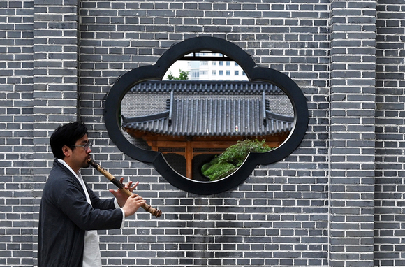 2022年5月7日,曹昊在吹奏尺八。35岁的曹昊是河北石家庄一位古琴老师,也是尺八制管师。2021年,曹昊成立了尺八工坊,免费教授人们尺八演奏技艺,已有30多名学员,其中很大一部分是“90后”。