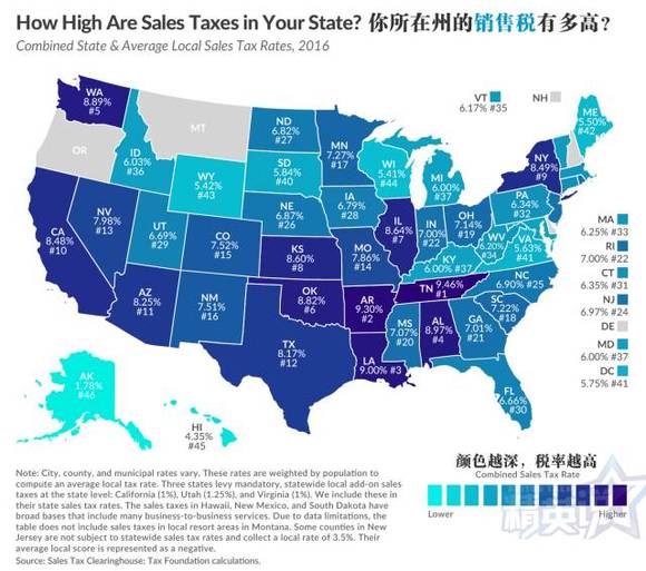 截止目前,销售税最高的并不是纽约或者加州,而是美国中南部的田纳西州——竟最高达到9.46%, 榜眼和探花分别是阿肯色州(9.30%)和路易斯安那州(8.87%)。