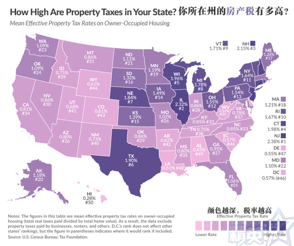 要注意的是,以上是各州房产税的平均值。同样价位的房产,在州内不同城市、不同学区的房产税征税方法和税率可能会大有不同。