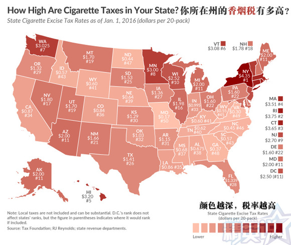最低的是密苏里州,这是美国的烟叶种植大户,只收0.17美元/20包;而最高的纽约州要到0.17美元/20包。但事实上,同州但不同地方县市政府征收的税费是不同的:比如说在芝加哥,州县市所有的税加起来只要6.16美元,但纽约市的吸烟者需要付5.85美元每包。