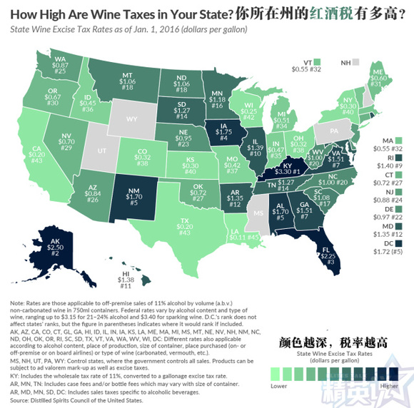 要注意的是,上图的这些税率适用于非即饮市场酒精度为11%(a.b.v.)的750ml装静态类葡萄酒。一些州对其他葡萄酒的征税税率可能不同,比如说起泡酒;对酒精浓度更高的葡萄酒也会收更高的税。