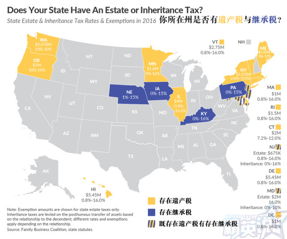 美国联邦政府2016年的遗产免税额是545万美元,最高联邦遗产税率可达40%。除此之外, 很多州还有自己的遗产税和继承税, 而且起征额一般在1百万, 远低于联邦,税率大概在16%左右。