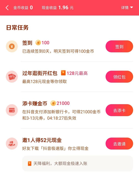 使用过极速版APP的用户都清楚,极速版最大吸引力并非“极速”,而是任务奖励。比如抖音、快手极速版的刷短视频获取金币。在运营逻辑上与趣头条非常相似,在用户登录、拉新、停留等环节以金币给予鼓励,是典型的网赚模式。