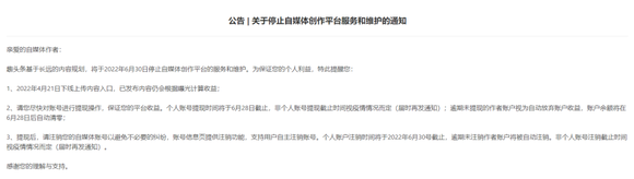 这与“老大哥”的离场路径如出一辙。2022年4月,趣头条宣布将于2022年6月30日停止自媒体创作平台的服务和维护,并将于4月21日当天,下线上传内容入口。