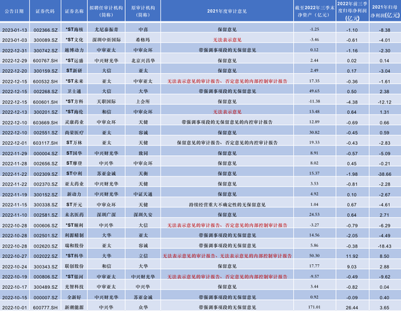 最典型的如*ST文化,拟聘任的会计师事务所深圳中炘国际成立于2020年4月,仅有合伙人2名、注册会计师5名,2022年证券业务收入0万元。