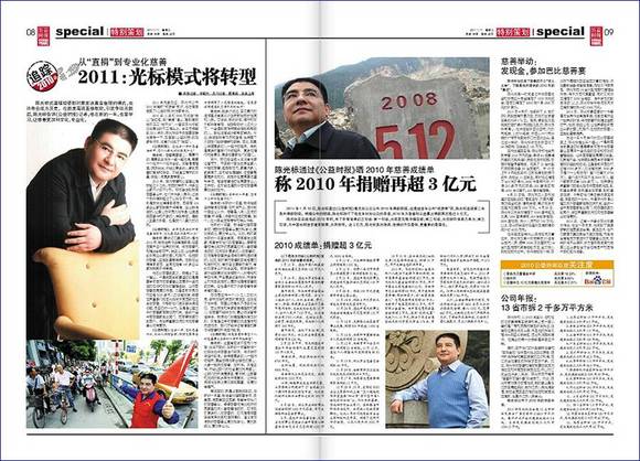 ▲ 2011年1月11日,《公益时报》两版刊发陈光标慈善事迹,并在文中标注“以下是陈光标给《公益时报》发来的2010年的慈善成绩单。”