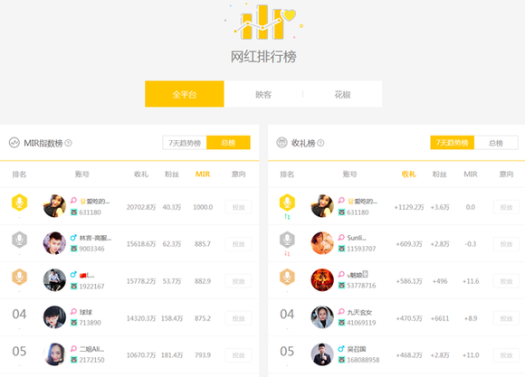 (图为9月27日实时网红排行榜,除了“MIR指数榜”、“收礼榜”以外,还有“粉丝榜”、“点赞榜”等)