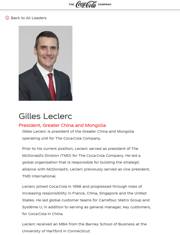 可口可乐公司表示,他曾在可口可乐中国市场担任大客户业务总经理,带领团队服务全国零售及即饮渠道客户,负责品类管理、渠道营销、财务、人力资源、供应链,及能力发展等职能。