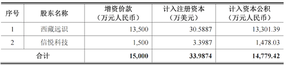 2021年12月最后一次增资时,公司注册资本由679.75万美元增加至713.74万美元,新增注册资本33.99万美元由新股东西藏远识以1.35亿元认缴30.59万美元注册资本;信悦科技以1500万元认缴3.40万美元注册资本,合计1.50亿元。