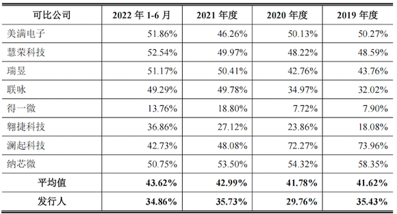 同行业可比公司美满电子(MEVL.O)、慧荣科技(SIMO.O)、瑞昱(2379.TW)、联咏(3034.TW)等八家报告期平均毛利率分别对应为41.62%、41.78%、42.99%和43.62%。