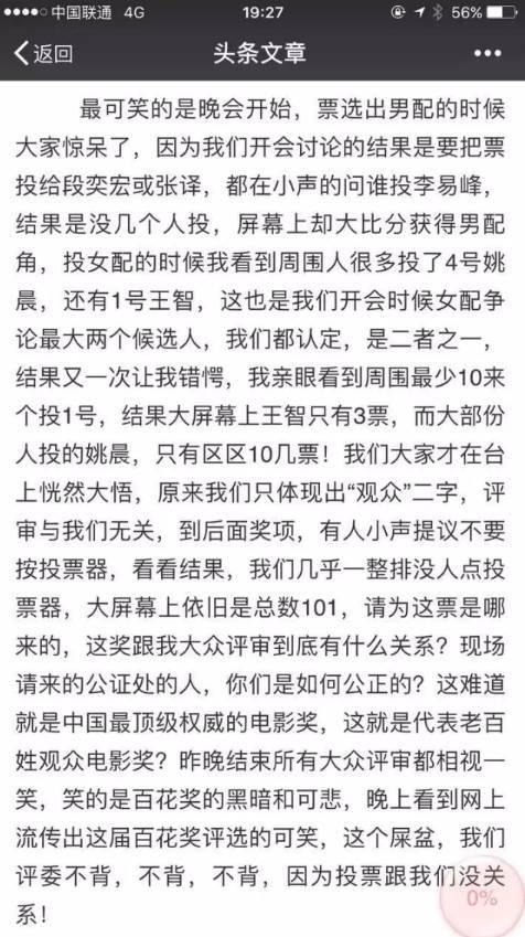 百花奖评奖结果出来之后,微博上名为“先锋团支部”的网友发出一篇名为《直击百花奖黑幕》的长文章,声称自己是这届百花奖参与投票的101位大众评审中的一名,他详细介绍了投票过程,让人们看到这样不合情理的结果是如何产生的。