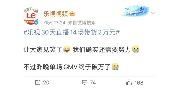 比如乐视曾开直播想带货自家产品,也上了热搜,可惜是“乐视 30天直播 14场带货 2万元”。