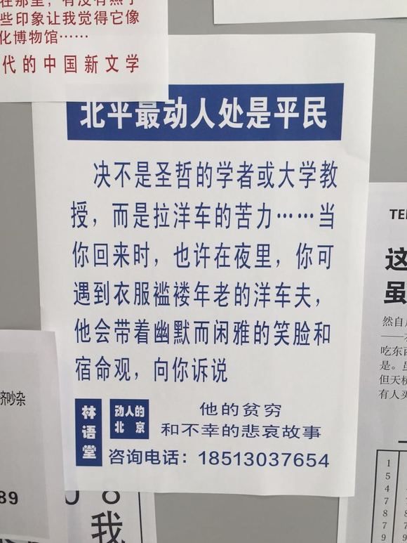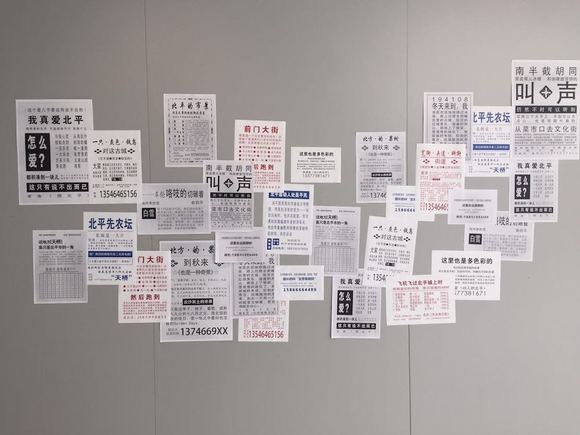 在白塔寺社区,韩雪和她的伙伴林蔼、林婉嫕、康梦龙就想在安安静静的鲁迅博物馆里办一场展。他们的展览名字叫“字里巷间话北京”,为了应鲁迅故居的景,韩雪和林蔼把民国时期文学作品中的北京都摘录了下来,用小广告的方式粘在墙上。