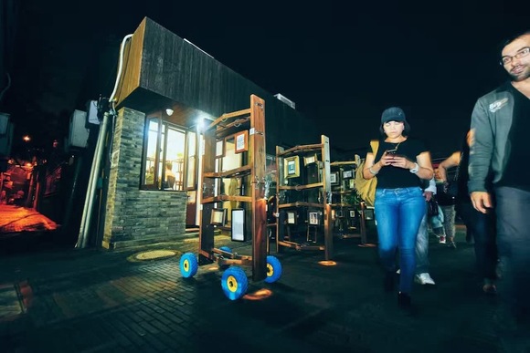 遇到土豆小姐完全是个意外。那天是夜里八九点,杨梅竹斜街已经黑压压一片,土豆小姐却很嗨,她正拿着鸡尾酒杯和打扮成“诗仙”的男生合照,他们旁边竖立着十几个移动木头架子,上面挂着小框装裱起来的诗和画。