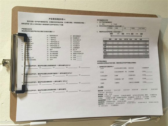 陈冠云拿着设备在街头巷尾收录各种声音,麻将声、车流声、自行车铃的铛铛声,参观者在通过耳机听到这些声音杂糅在一起后,会回答一张问卷。“ 我想让人们去评价哪些声音好,哪些声音不好。安静的空间并不一定让人感到舒服,而那些让人感到愉悦的声音才有利于城市居民的幸福感。 我们可能没法改变社区的业态,但可以改善听觉,比如叫卖者可以换个吆喝词。”