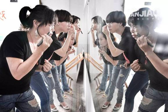 ▲小青(楼梯第二层中)印象最深的是做餐饮时同事之间会相互排挤,向领导打小报告;而现在在工厂因为不让说话,大家都只是不停地埋头干活。现在所在的工厂很不遵守劳动法,底薪只有1700元,加班费11元一个钟。