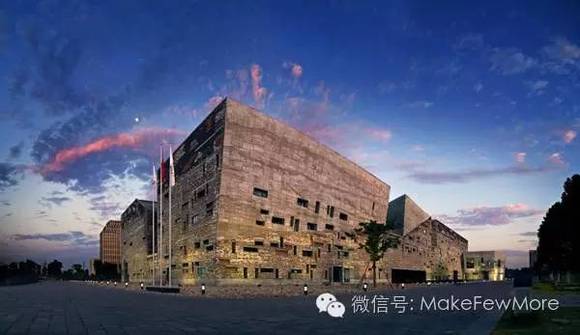 该建筑曾获得过普利兹克建筑奖,以创新的理念将宁波特色、传统建筑元素与现代工艺元素巧妙融合,造型简约而灵动,外观严谨而颇具创意。外观设计使用‘瓦爿墙’,大量使用回收材料,是为了节约资源,也体现了循环建造这一中国传统美德。这些旧砖瓦和陶片见证了历史又融于自然,与博物馆“收集历史”的理念相投。