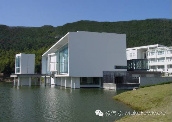 建筑整体的理念依然是建筑隐匿于山水中,试图找到人与自然相互平衡的界点。山脚的一片竹海为背景,波光粼粼的湖面是为前景,几个白色“盒子”似跳跃般的姿势,又似随意堆放的几何体,动静之间,与大自然和谐共处。小立方体冲破大立方体的束缚,从而完成了一种“复杂建筑——简单城市”的跃进。
