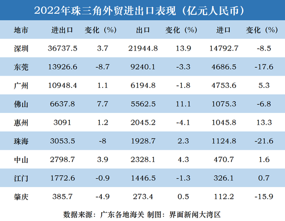 尽管这是广东连续第37年蝉联全国第一,但其增速也落后于全国平均水平。海关统计显示,2022年我国外贸进出口增速达7.7%,出口和进口分别增长10.5%、4.3%。广东整体增速低于全国7.2个百分点。