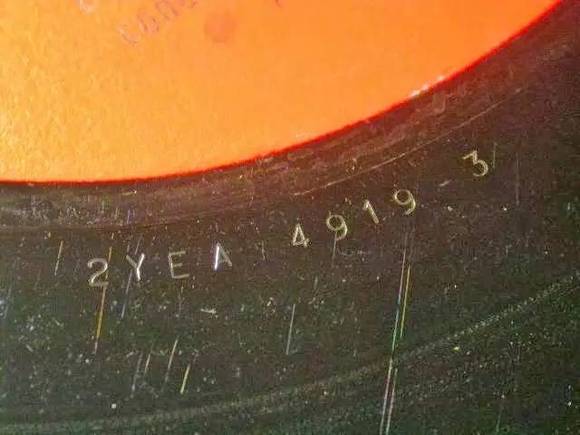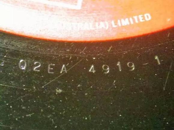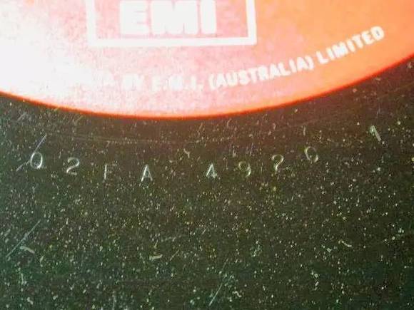早期的EMI还有一个特殊的标志,在标签靠近中心孔的地方有两个字母,称为taxcode,表示年份,现在我们可以依靠这个判断发行年份。