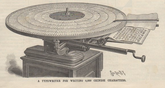 1880年代,历史上的第一台中文打字机由美国传教士谢卫楼发明。1899年3月6日,《科学美国人》刊登了一幅谢卫楼发明的中文打字机图片,它看上去与雷明顿打字机截然不同。这台打字机由一个大圆盘构成,上面密密麻麻地排列了30圈汉字(总计4662个),这些汉字按照使用频率进一步分入四个分区。所谓“打字”,实际上是打字员用手操作选字杆,择取所需的汉字。这一发明虽然令谢卫楼倍感自豪,但它一直停留在原型机的阶段。