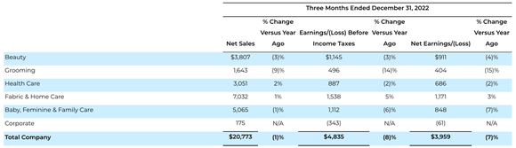 1月19日晚间,宝洁公布了2023财年第二季度(2022年10-12月)财报。报告期内,宝洁净销售额为207.73亿美元(约合人民币1409.65亿元),同比下滑1%;净利润为39.59亿美元(约合人民币268.66亿元),同比下滑7%。