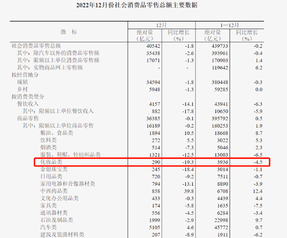 据国家统计局数据,2022年我国化妆品零售总额为3936亿元,同比下滑了4.5%,下滑幅度远大于社会消费品零售总额的0.2%。12月当月,化妆品零售总额为290亿元,同比下滑了19.3%,这已是连续5个月下滑,而整年也仅有4个月呈正增长。