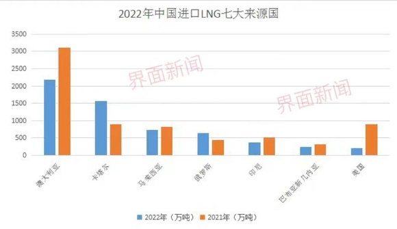 中国海关数据显示,2022年,中国从澳大利亚进口LNG约2185.3万吨,同比减少30%;从卡塔尔进口1569.57万吨,同比增加75%;从马来西亚进口736.9万吨,同比减少11%。