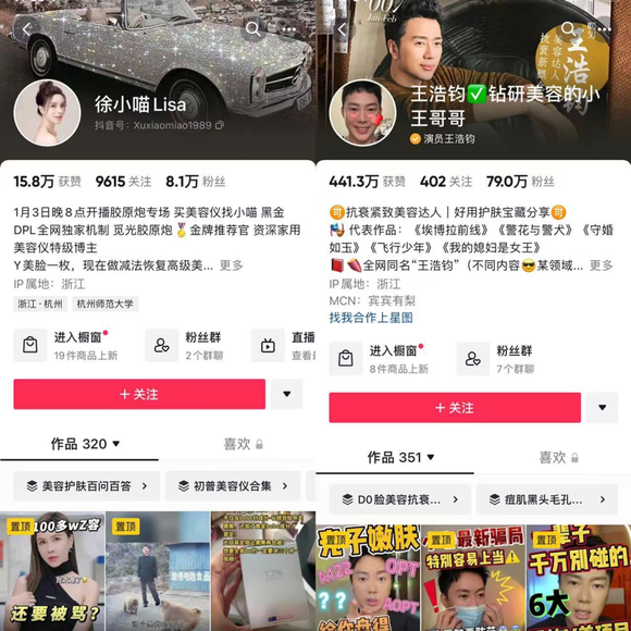 另外2位客单价在千元级的达播账号徐小喵Lisa及王浩钧,则是通过科普医美以各类家用美容仪,以及亲身试用的呈现效果的内容来建立人设。在这2位达人的自我介绍中,自称为“抗衰精致美容达人”及“ 资深家用美容仪特级博主”。