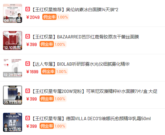 如王红权星的合作带货商品中,近30天销售额top5的产品,除了听研美容仪器之外,均是国外的各类面膜,客单价在400-2000元不等。