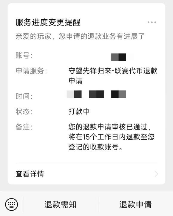 一切都申请完,圆圆把自己的截图发进了开黑群里,没有配别的文字,只是想着提醒一下大伙。截图里包含了圆圆的退款项目与结算系数——比如1块守望先锋金币对应0.06元——最终换算出一个实际退款数字。