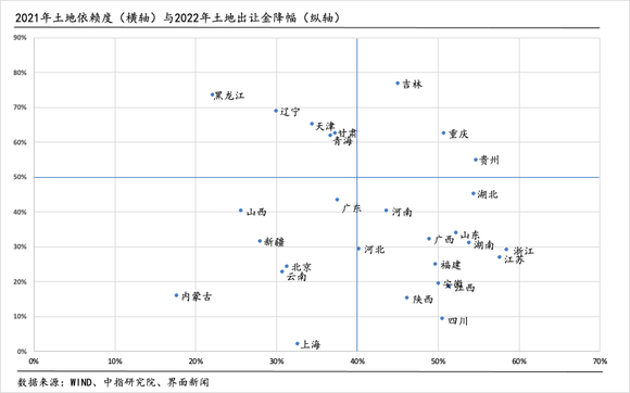 在土地出让收入普降的情况下,土地依赖度高的地区财政压力会更大。结合2021各省土地依赖度(土地依赖度=政府性基金收入/地方一般公共预算收入+政府性基金收入)和2022年土地出让金降幅来看,吉林、重庆和贵州三地面临的财政压力较大。一方面,这三个地区对土地财政的依赖度较高,另一方面,三地去年土地出让收入降幅较大。